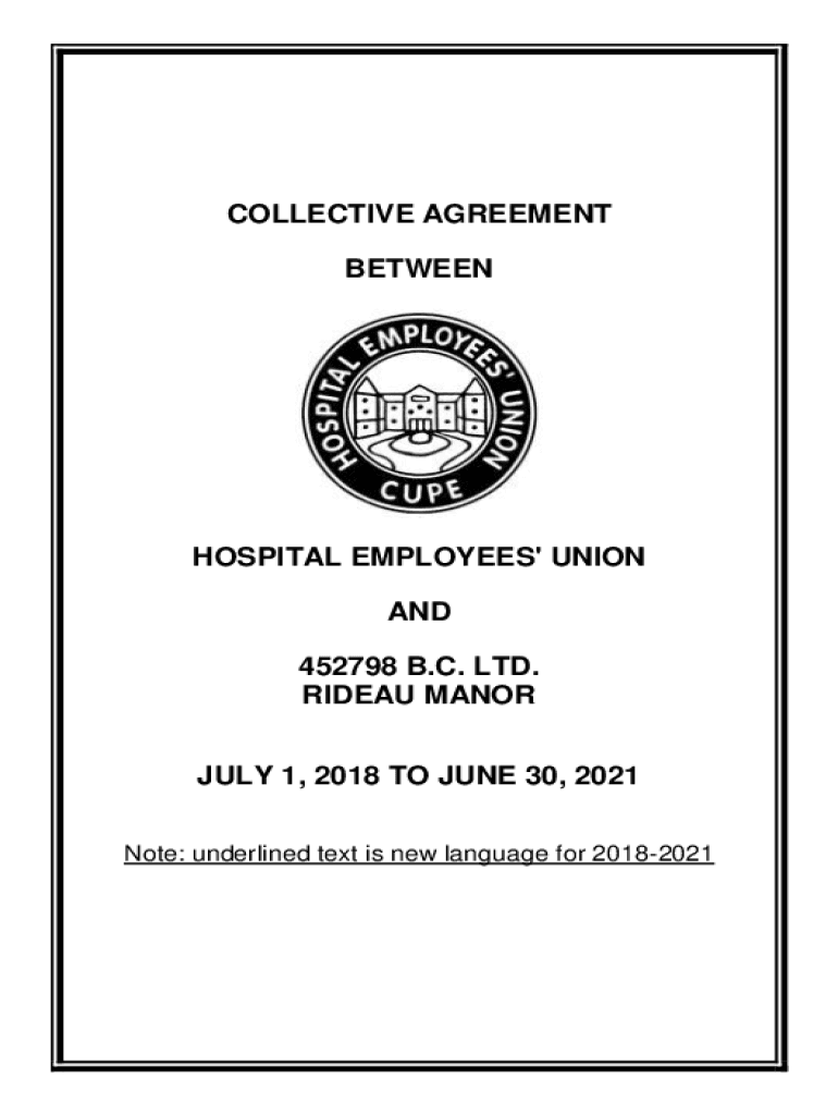 COLLECTIVE AGREEMENT BETWEENHOSPITAL EMPLOYEES\' UNION AND 452798 B.C. LTD. RID EAU MANOR JULY 1, 2018, TO JUNE 30, 2021, Note: underlined text is new language for 20182021RIDEAU MANOR 1850 Roster