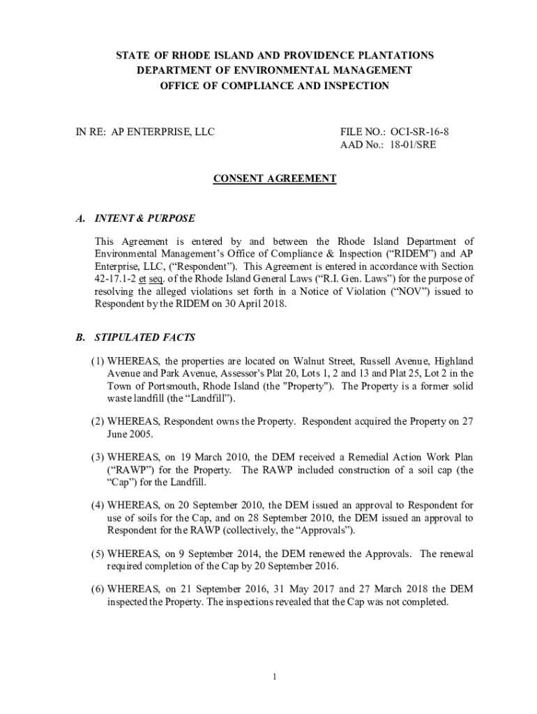 STATE OF RHODE ISLAND AND PROVIDENCE PLANTATIONS DEPARTMENT OF ENVIRONMENTAL MANAGEMENT OFFICE OF COMPLIANCE AND INSPECTION IN RE: AP ENTERPRISE, LUCILE NO.: OCISR168 AAD No.: 1801/CONSENT AGREEMENT.