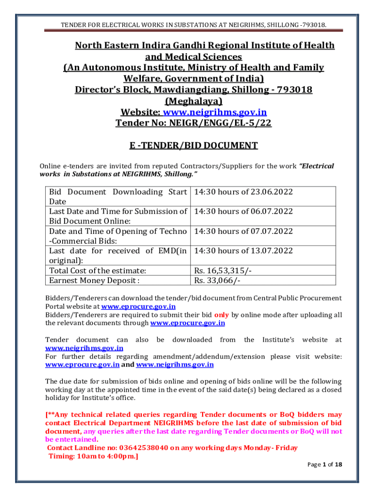 TENDER FOR ELECTRICAL WORKS IN SUBSTATIONS AT NEIGHS, SHILLONG 793018. North Eastern Indira Gandhi Regional Institute of Health