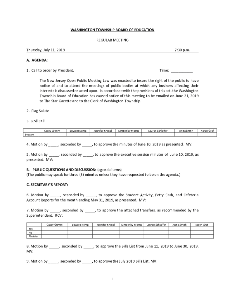 WASHINGTON TOWNSHIP BOARD OF EDUCATION REGULAR MEETING Thursday, July 11, 20197:30 p.m.A. AGENDA: 1. Call to order by President. Time: ___The New Jersey Open Public Meeting Law was enacted to insure