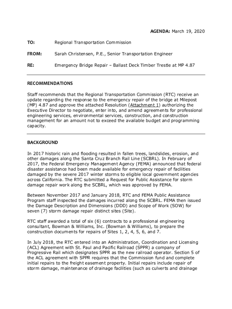 AGENDA: March 19, 2020, TO:Regional Transportation Commissioner:Sarah Christensen, P.E., Senior Transportation Engineer RE:Emergency Bridge Repair Ballast Deck Timber Trestle at MP 4.87RECOMMENDATIONS