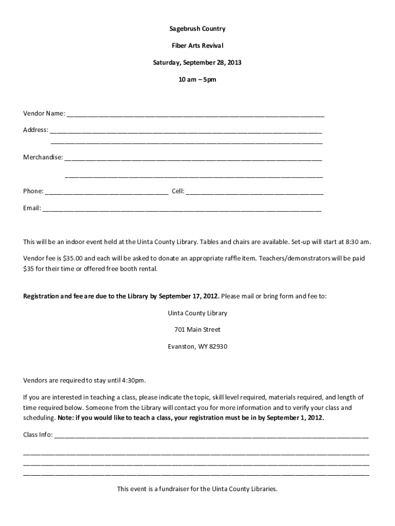 Sagebrush Country Fiber Arts Revival Saturday, September 28, 2013 10 am 5pmVendor Name: ___ Address: ___ ___ Merchandise: ___ ___ Phone: ___ Cell: ___ Email: ___This will be an indoor event held at