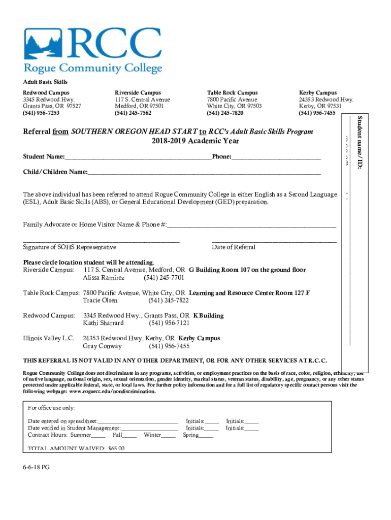 Adult Basic Skills Riverside Campus 117 S. Central Avenue Medford, OR 97501 (541) 2457562Table Rock Campus 7800 Pacific Avenue White City, OR 97503 (541) 2457820Kerby Campus 24353 Redwood Hwy. Derby,