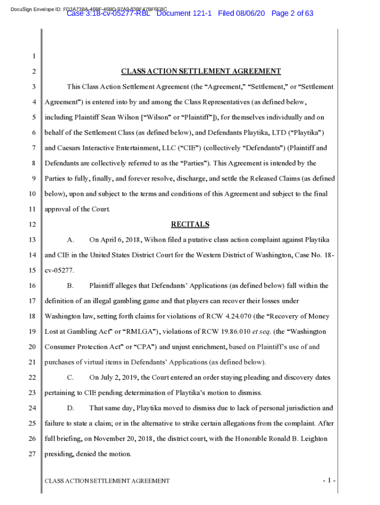 Case 3:18cv05277RBL Document 1211 Filed 08/06/20-Page 2 of 631 2CLASS ACTION SETTLEMENT AGREEMENT3This Class Action Settlement Agreement (the Agreement, Settlement, or Settlement4Agreement) is entered