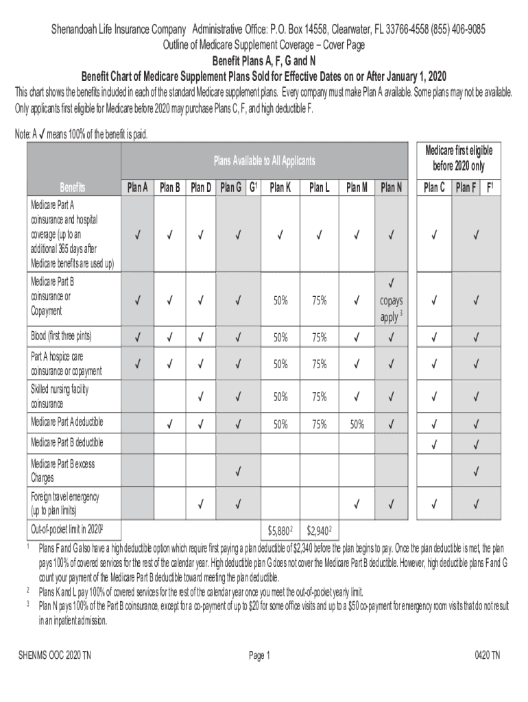 Shenandoah Life Insurance Company Administrative Office: P.O. Box 14558, Clearwater, FL 337664558 (855) 4069085 Outline of Medicare Supplement Coverage Cover Page Benefit Plans A, F, G and N Benefit
