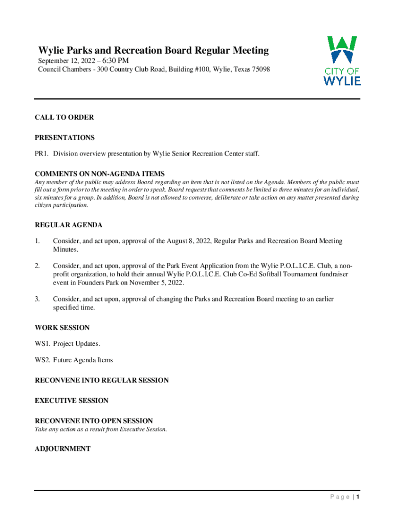 Wylie Parks and Recreation Board Regular Meeting September 12, 2022 6:30 PM Council Chambers 300 Country Club Road, Building #100, Wylie, Texas 75098CALL TO ORDER PRESENTATIONS PR1. Division overview