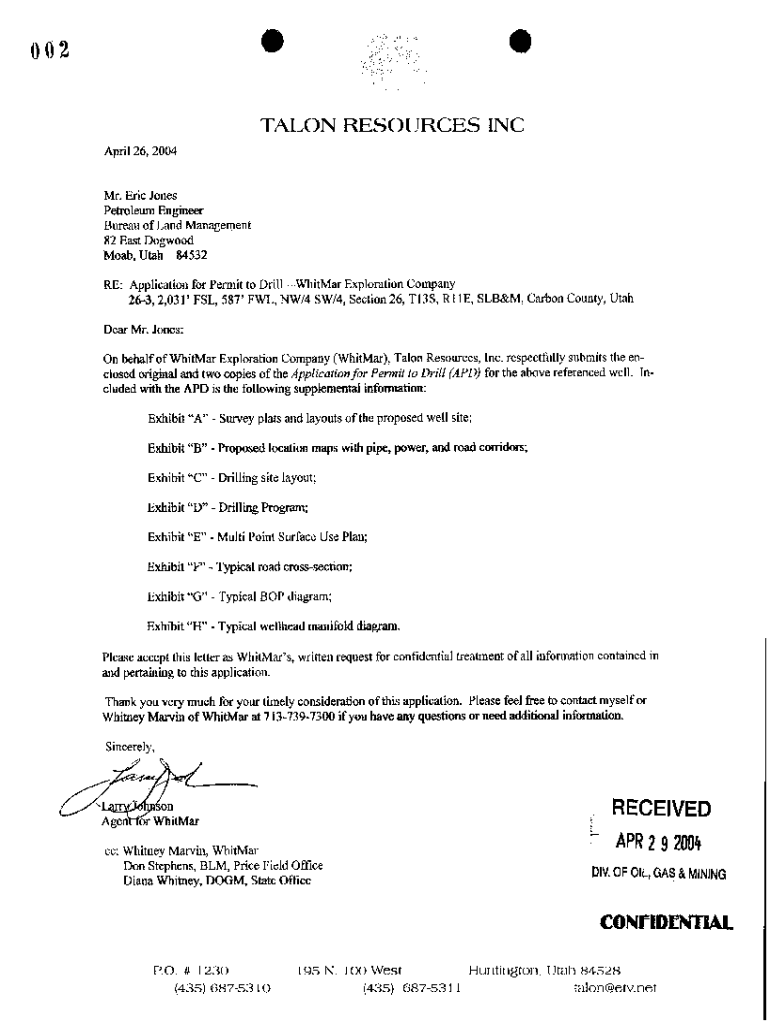 Oo62OTALONRESOURCESINCApril 26, 2004Mr. Eric Jones Petroleum Engineer Bureau of Land Management 82 East Dogwood Moab, Utah 84532 Exploration Company RE: Application for Permit to DrillWhitMar 263,