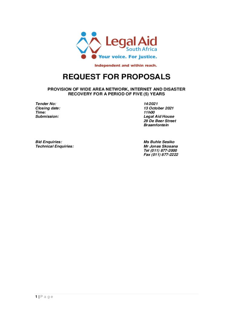 REQUEST FOR PROPOSALS PROVISION OF WIDE AREA NETWORK, INTERNET AND DISASTER RECOVERY FOR A PERIOD OF FIVE (5) YEARS Tender No: Closing date: Time: Submission:14/2021 13 October 2021 11h00 Legal Aid