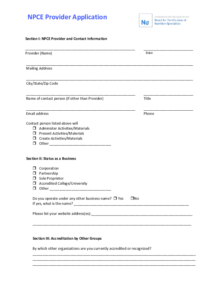 NICE Provider Application Section I: NICE Provider and Contact Information ___ Provider (Name)___ Date___ Mailing Address ___ City/State/Zip Code ___ Name of contact person (if other than Provider)___