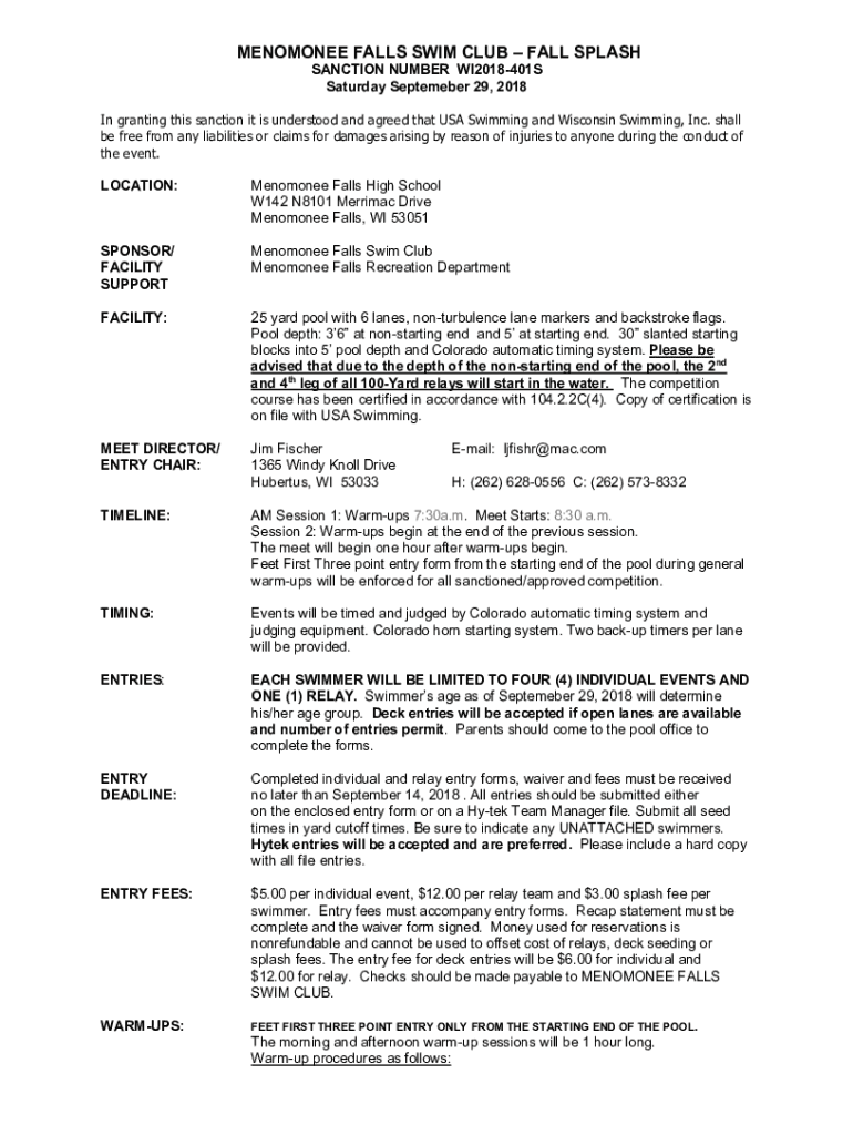 MENOMONEE FALLS SWIM CLUB FALL SPLASH SANCTION NUMBER WI2018401S Saturday, September 29, 2018, In granting this sanction it is understood and agreed that USA Swimming and Wisconsin Swimming, Inc.