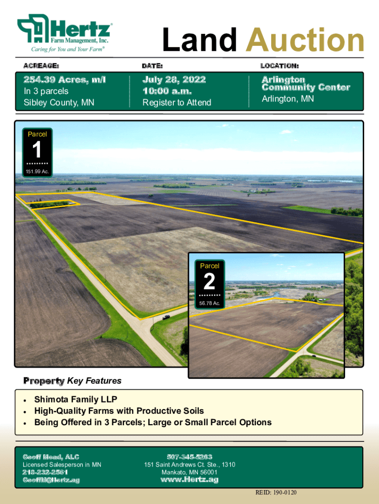 Land Auction ACREAGE:DATE:LOCATION:254.39 Acres, m/l In 3 parcels Bible County, MN July 28, 2022 10:00 a.m. Register to Attend Arlington Community Center Arlington, MNParcel1151.99 Ac. Parcel256.78