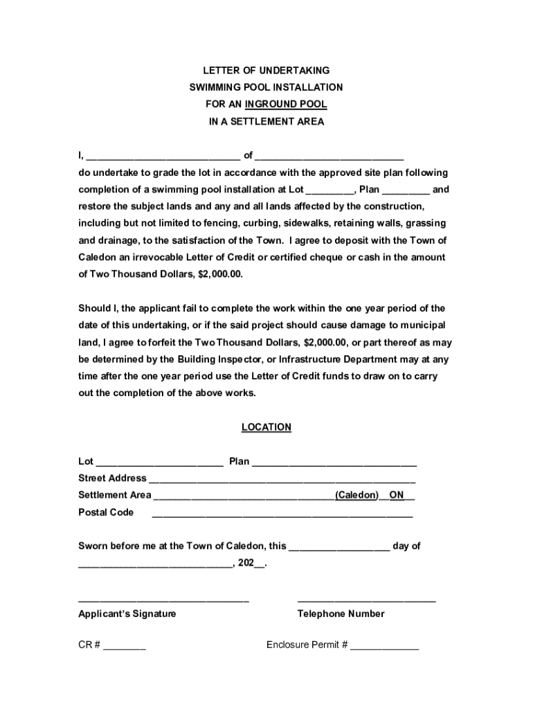 LETTER OF UNDERTAKING SWIMMING POOL INSTALLATION FOR AN IN-GROUND POOL IN A SETTLEMENT AREA I, ___ of ___ do undertake to grade the lot in accordance with the approved site plan following completion