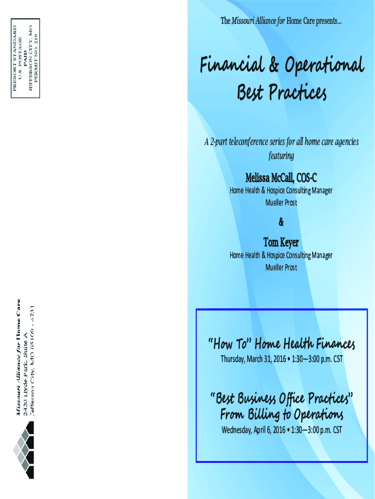 The Missouri Alliance for Home Care presentsFinancial & Operational Best Practices A 2part teleconference series for all home care agencies featuring Melissa McCall, COST Home Health & Hospice Consulting