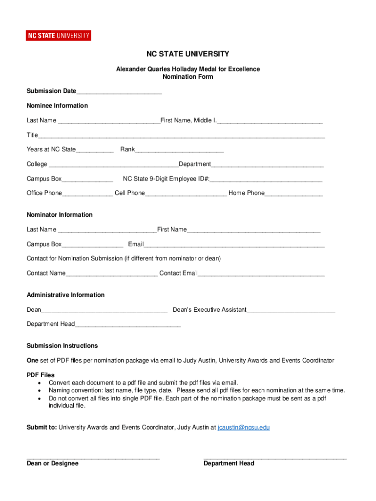 NC STATE UNIVERSITY Alexander Quarles Holladay Medal for Excellence Nomination Form Submission Date___ Nominee Information Last Name ___First Name, Middle I.___ Title___ Years at NC State___Rank___College