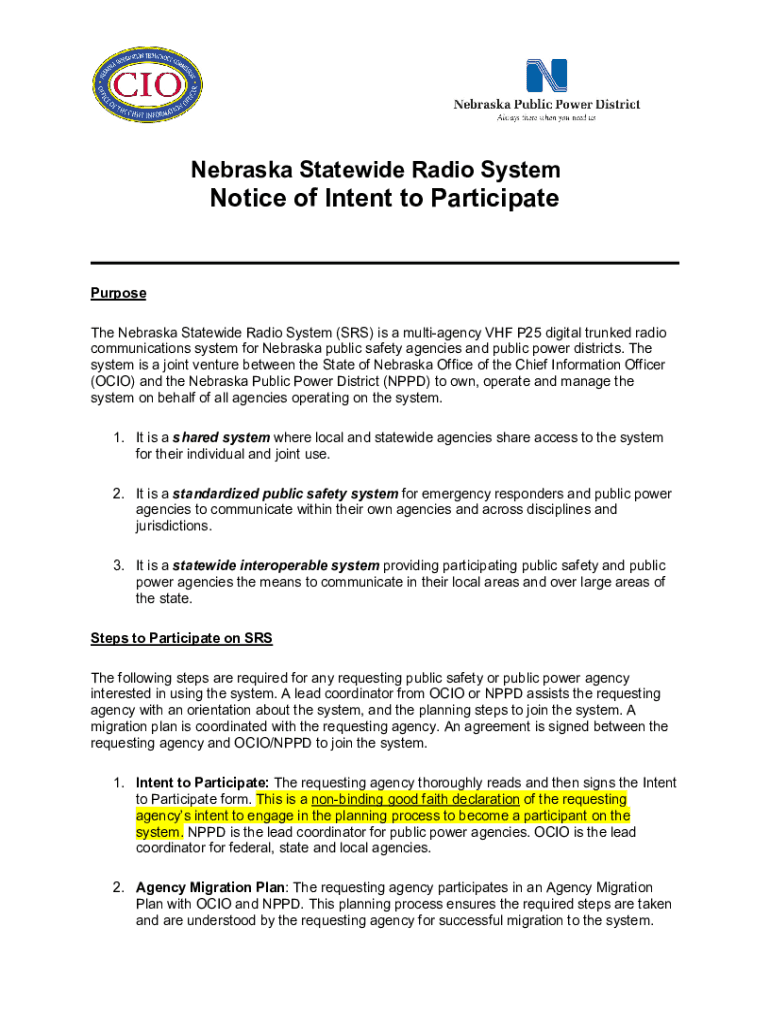 Nebraska Statewide Radio Systematic of Intent to ParticipatePurpose The Nebraska Statewide Radio System (SRS) is a multiagency VHF P25 digital trucked radio communications' system for Nebraska public