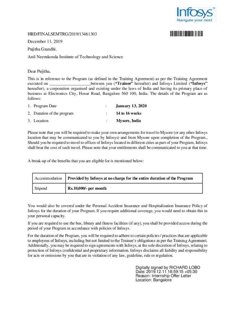 N#Pushed/FINALSEMTRG/2019/13461303 December 11, 2019, Sujatha Gandhi. Anil Neerukonda Institute of Technology and Science Dear Sujatha, This is in reference to the Program (as defined in the Training