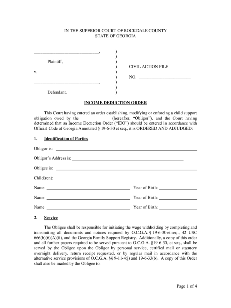 IN THE SUPERIOR COURT OF ROCKDALE COUNTY STATE OF GEORGIA___, Plaintiff, v. ___, Defendant.) ))))))))CIVIL ACTION FILE NO. ___INCOME DEDUCTION ORDER This Court having entered an order establishing,
