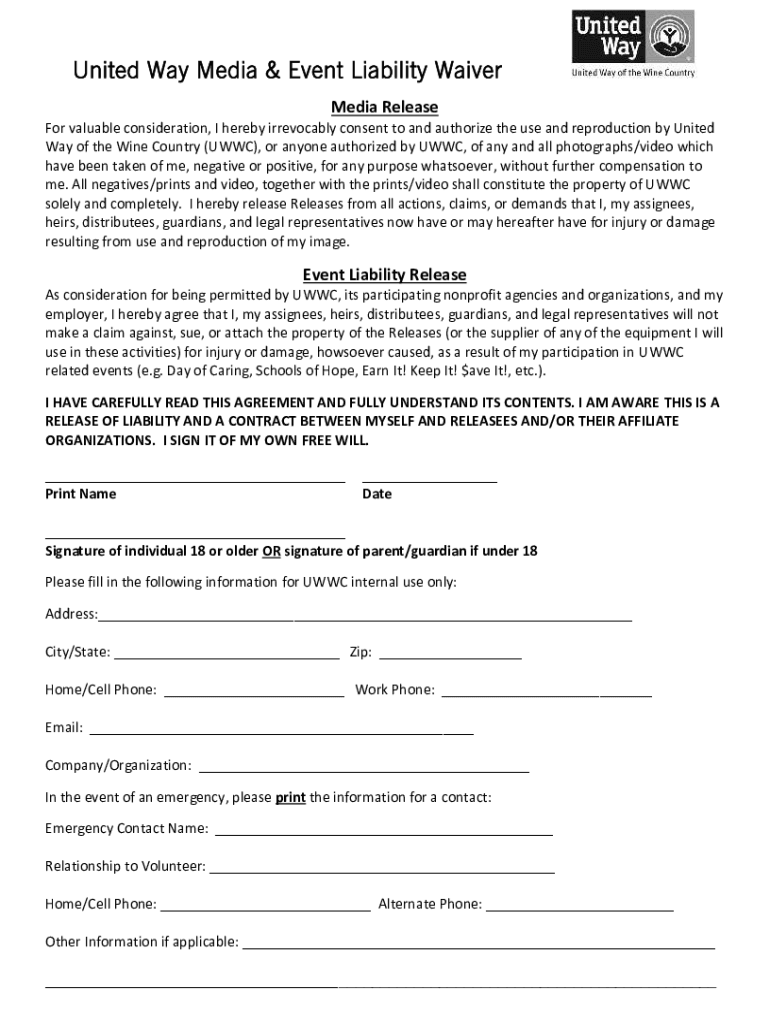 United Way Media & Event Liability Waiver Media Releaser valuable consideration, I hereby irrevocably consent to and authorize the use and reproduction by United Way of the Wine Country (UWC), or