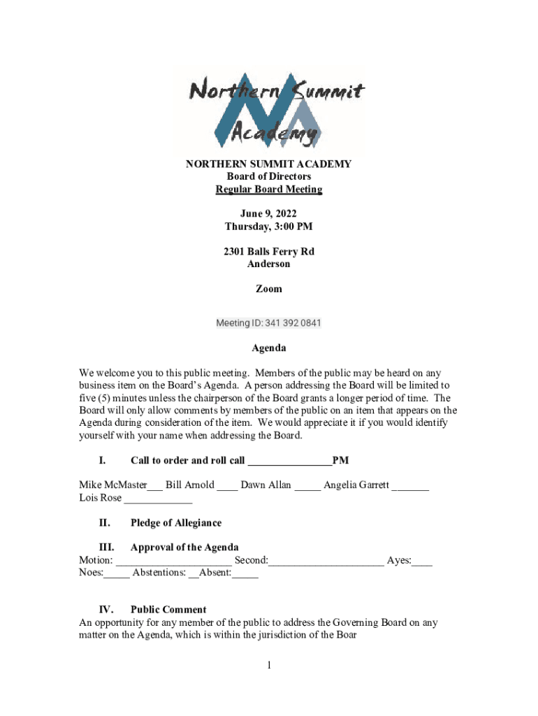 NORTHERN SUMMIT ACADEMY Board of Directors Regular Board Meeting June 9, 2022, Thursday, 3:00 PM 2301 Balls Ferry Rd Anderson Zoom Meeting ID: 341 392 0841Agenda We welcome you to this public meeting.