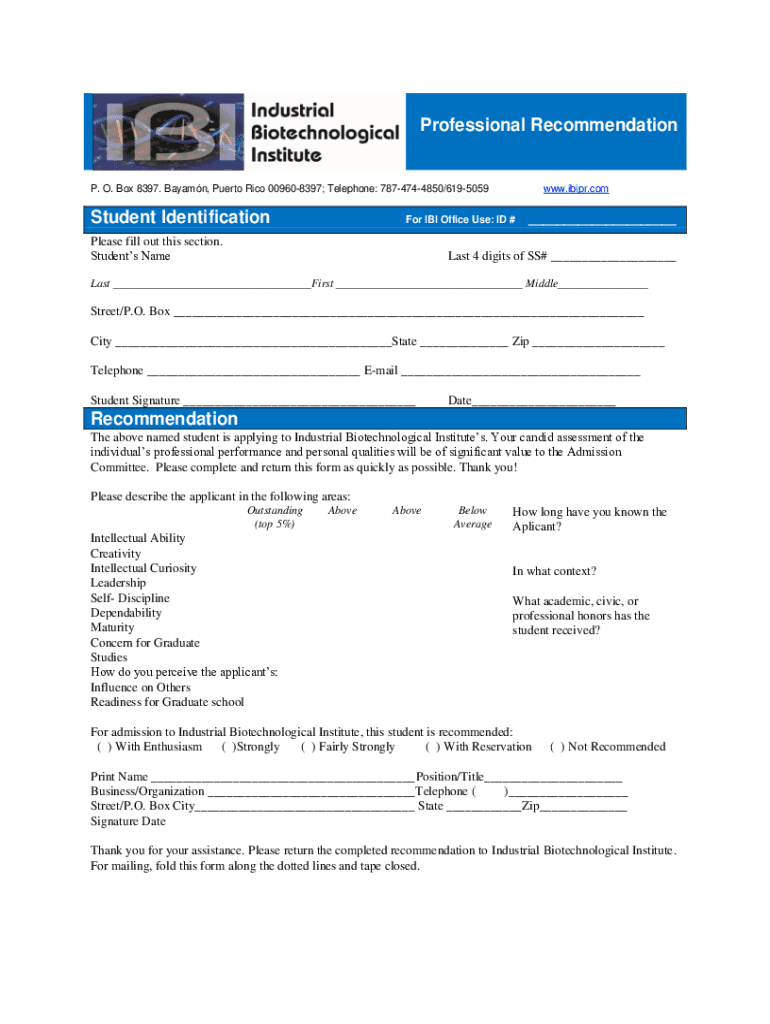 Professional Recommendation. O. Box 8397. Bayamon, Puerto Rico 009608397; Telephone: 7874744850/6195059Student Identification.ibid.comfort FBI Office Use: ID #Please fill out this section. Students