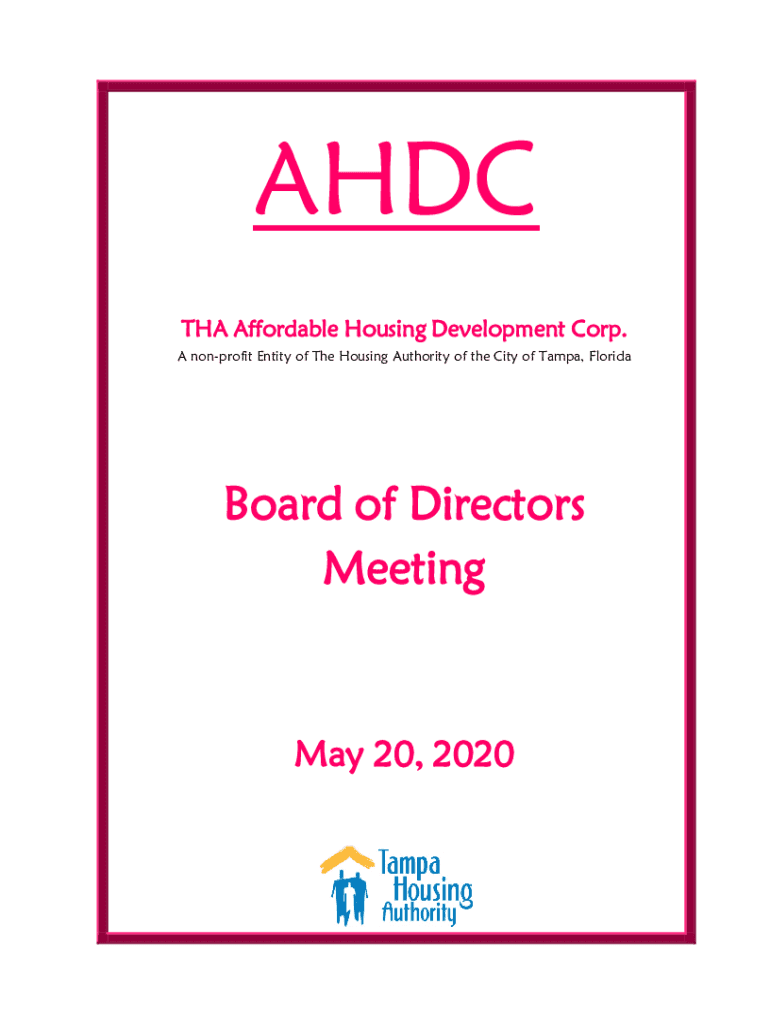 ADC THA Affordable Housing Development Corp. A nonprofit Entity of The Housing Authority of the City of Tampa, FloridaBoard of Directors Meeting May 20, 2020AHDC Meeting Agenda THA Affordable Housing