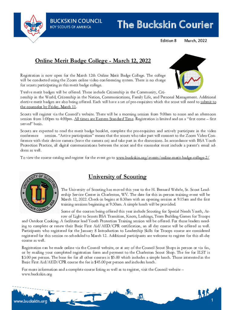 BUCKSKIN COUNCIL BOY SCOUTS OF American Buckskin Courier Edition 8March, 2022Online Merit Badge College March 12, 2022, Registration is now open for the March 12th Online Merit Badge College. The