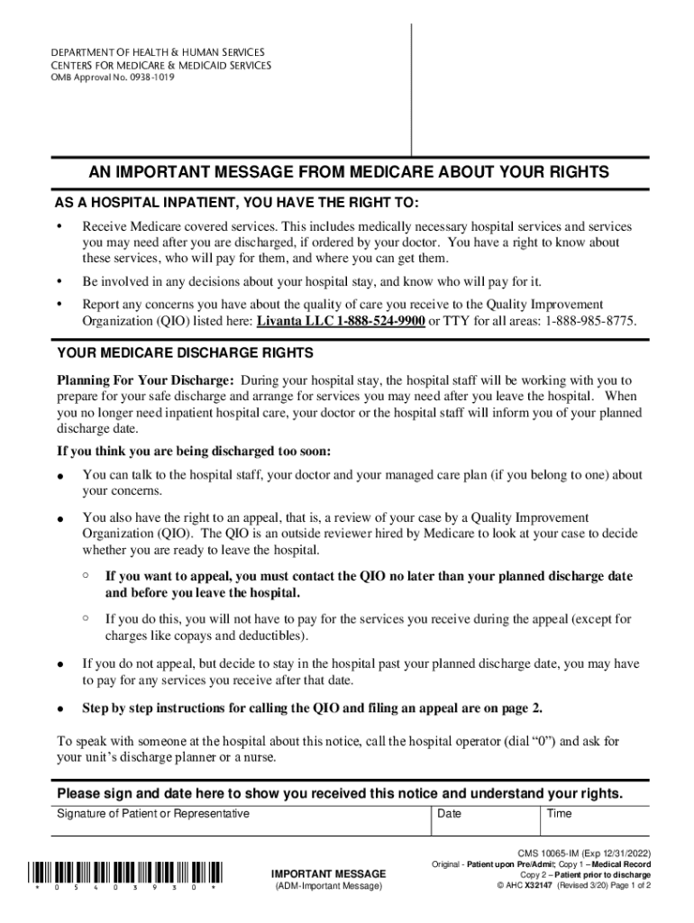 DEPARTMENT OF HEALTH & HUMAN SERVICES CENTERS FOR MEDICARE & MEDICAID SERVICES OMB Approval No. 09381019AN IMPORTANT MESSAGE FROM MEDICARE ABOUT YOUR RIGHTS AS A HOSPITAL INPATIENT, YOU HAVE THE RIGHT