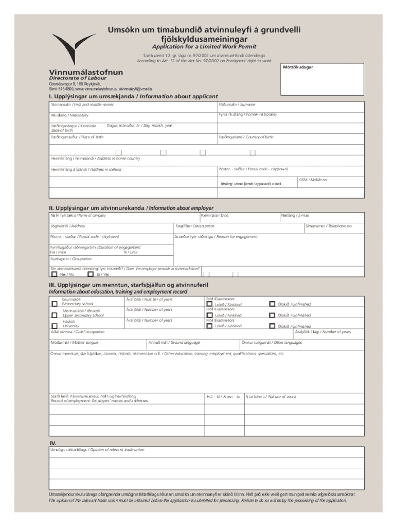 Application for a Limited Work PermitSamkvmt 12. Gr. lava NR. 97/2002 um atvinnurttindi blending