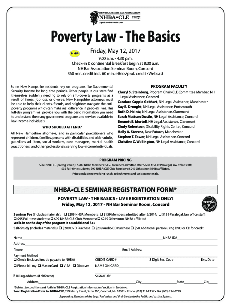 Poverty Law The Basics Friday, May 12, 2017 9:00 a.m. 4:30 p.m. Checking & continental breakfast begin at 8:30 a.m. NH Bar Association Seminar Room, Concord 360 min. credit incl. 60 min. ethics/prof.