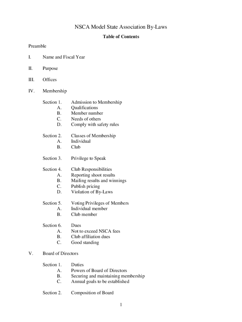 NSA Model State Association Bylaws Table of Contents Preamble I. Name and Fiscal Year. Purpose. Offices IV. Membership. Section 1. A. B. C. D. Admission to Membership Qualifications Member number
