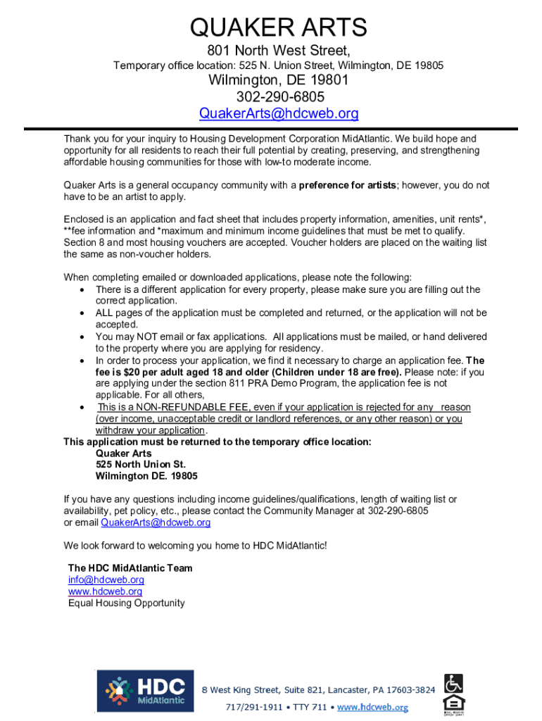 QUAKER ARTS 801 North West Street, Temporary office location: 525 N. Union Street, Wilmington, DE 19805Wilmington, DE 19801 3022906805 QuakerArts@hdcweb.orgThank you for your inquiry to Housing Development