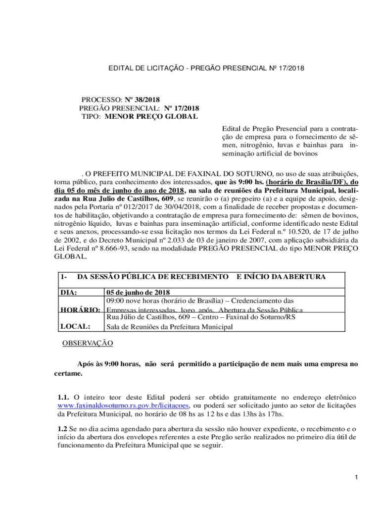 EDIT AL DE LICIT AO PRESO PRESENCE N 17/2018PROCESSO: N 38/2018