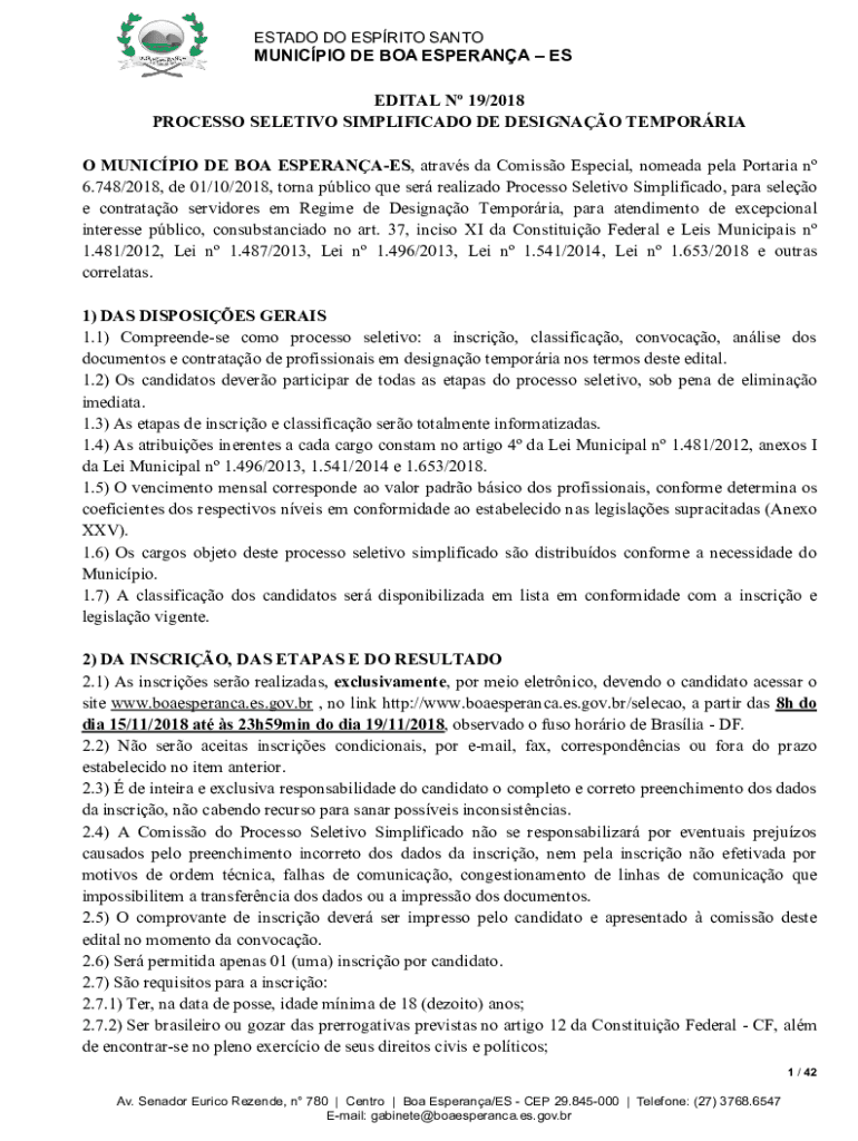 ESTATE DO ESPRIT SANTOMUNICPIO DE BOA ESPERANZA ES EDIT AL N 19/2018 PROCESS SELECTIVE SIMPLIFIED DE DESIGN AO EMPORIA O MUNICIPAL DE BOA ESPERANTO, trans the Comics Especial, nomads plea Port aria