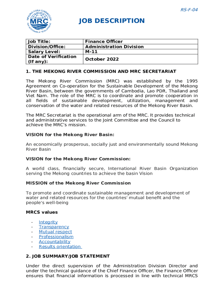RSF04JOB DESCRIPTION Job Title: Division/Office: Salary Level: Date of Verification (If any):Finance Officer Administration Division M11 October 20221. THE MEKONG RIVER COMMISSION AND MRC SECRETARIAT