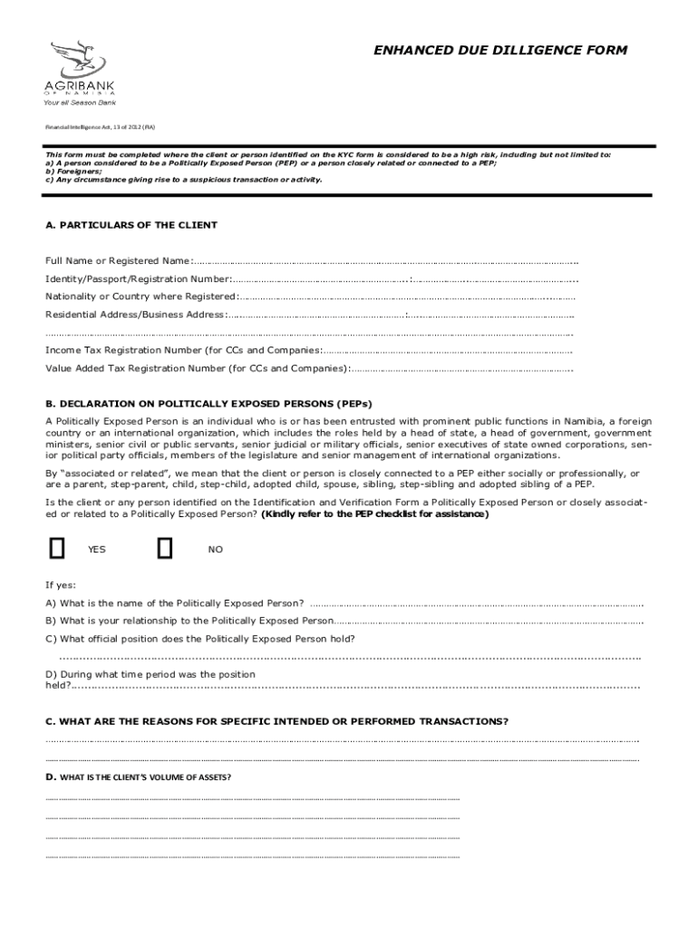 ENHANCED DUE DILIGENCE FORMFinancial Intelligence Act, 13 of 2012 (FIA)This form must be completed where the client or person identified on the KYC form is considered to be a high risk, including