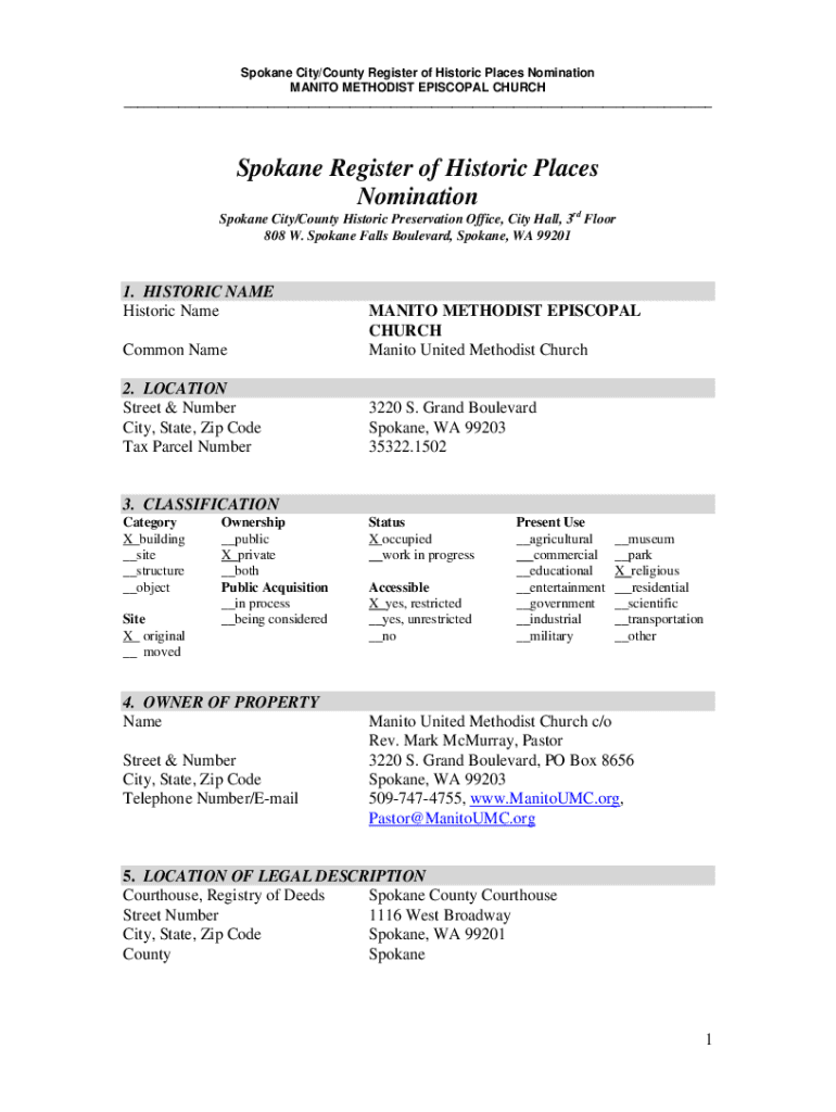 Spokane City/County Register of Historic Places Nomination MANITOU METHODIST EPISCOPAL CHURCH ___Spokane Register of Historic Places Nomination Spokane City/County Historic Preservation Office, City