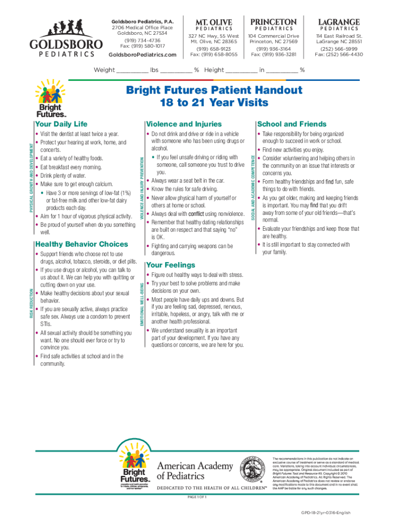 Get the free Bright Futures Patient Handout 18 to 21 Year Visits