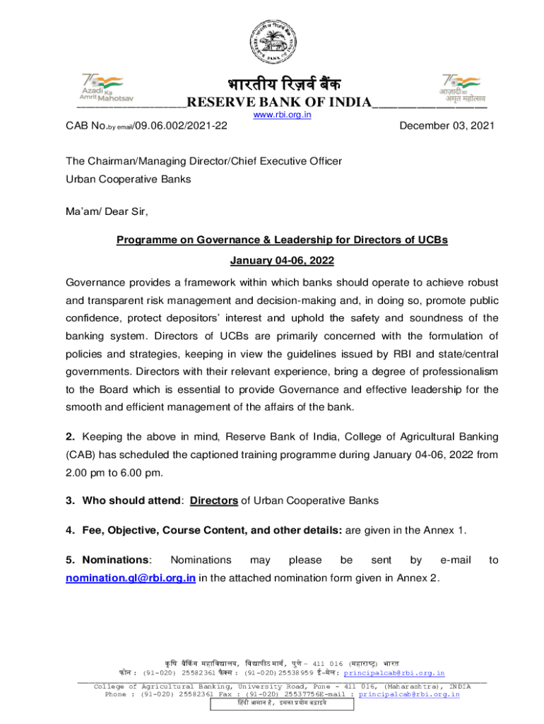 ___RESERVE BANK OF INDIA___ www.rbi.org.inCAB No. By email/09.06.002/202122December 03, 2021The Chairman/Managing Director/Chief Executive Officer Urban Cooperative Banks Madam/ Dear Sir, Program