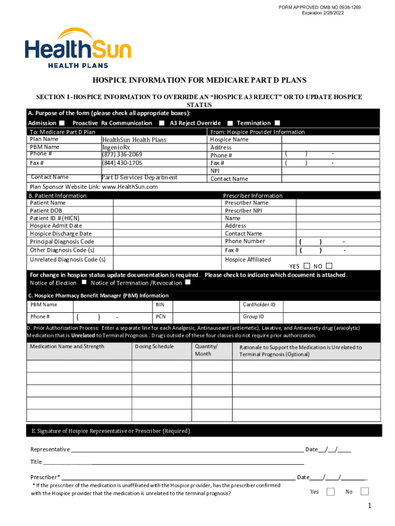 FORM APPROVED OMB NO 09381269 Expiration 2/28/2022HOSPICE INFORMATION FOR MEDICARE PART D PLANS SECTION I HOSPICE INFORMATION TO OVERRIDE AN HOSPICE A3 REJECT OR TO UPDATE HOSPICE STATUS A. Purpose