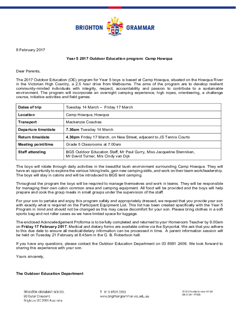 8 February 2017 Year 5 2017 Outdoor Education program: Camp How qua Dear Parents, The 2017 Outdoor Education (OE) program for Year 5 boys is based at Camp How qua, situated on the How qua River in