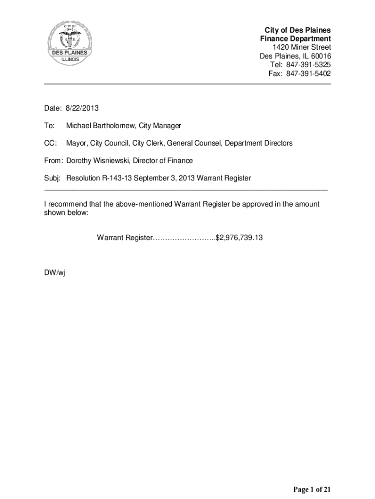 City of Des Plaines Finance Department 1420 Miner Street Des Plaines, IL 60016 Tel: 8473915325 Fax: 8473915402Date: 8/22/2013 To:Michael Bartholomew, City Manager CC:Mayor, City Council, City Clerk,
