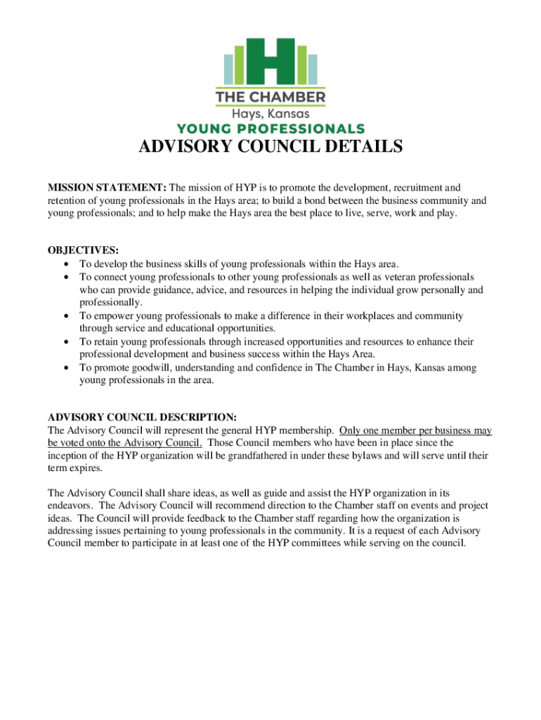 ADVISORY COUNCIL DETAILS MISSION STATEMENT: The mission of HIP is to promote the development, recruitment and retention of young professionals in the Hays area; to build a bond between the business
