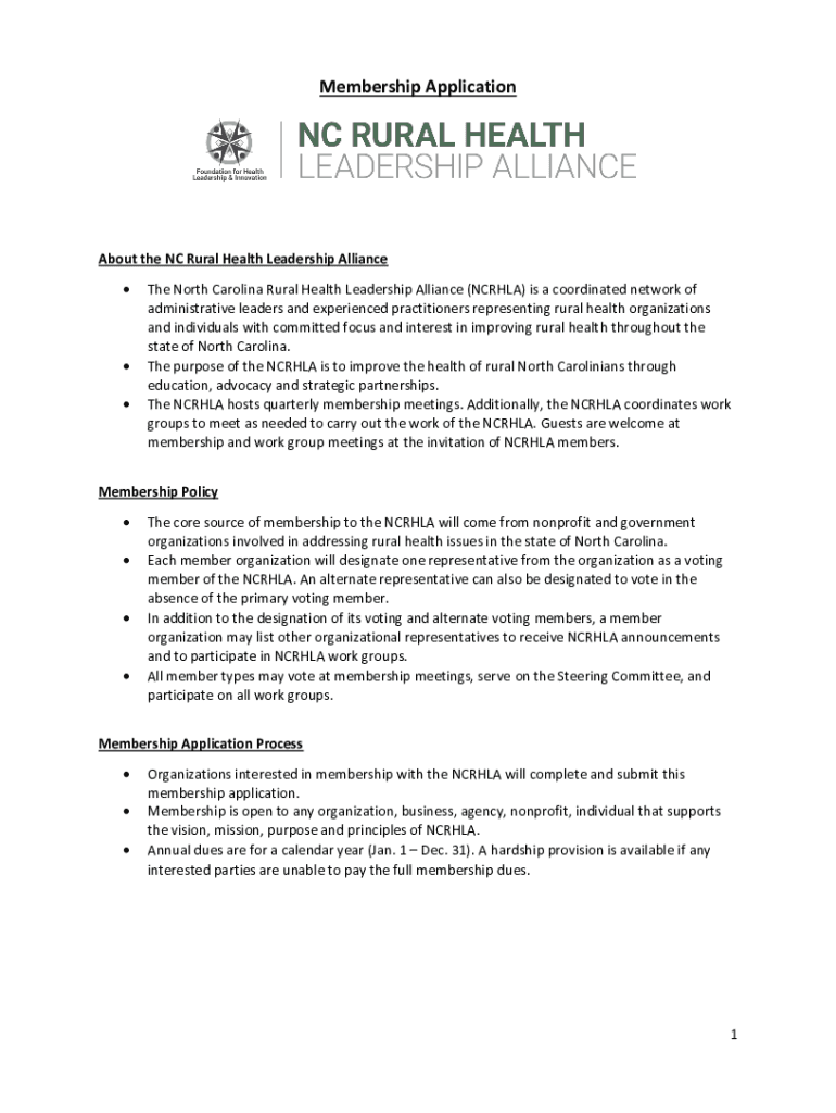 Membership ApplicationAbout the NC Rural Health Leadership Alliance The North Carolina Rural Health Leadership Alliance (NCR HLA) is a coordinated network of administrative leaders and experienced