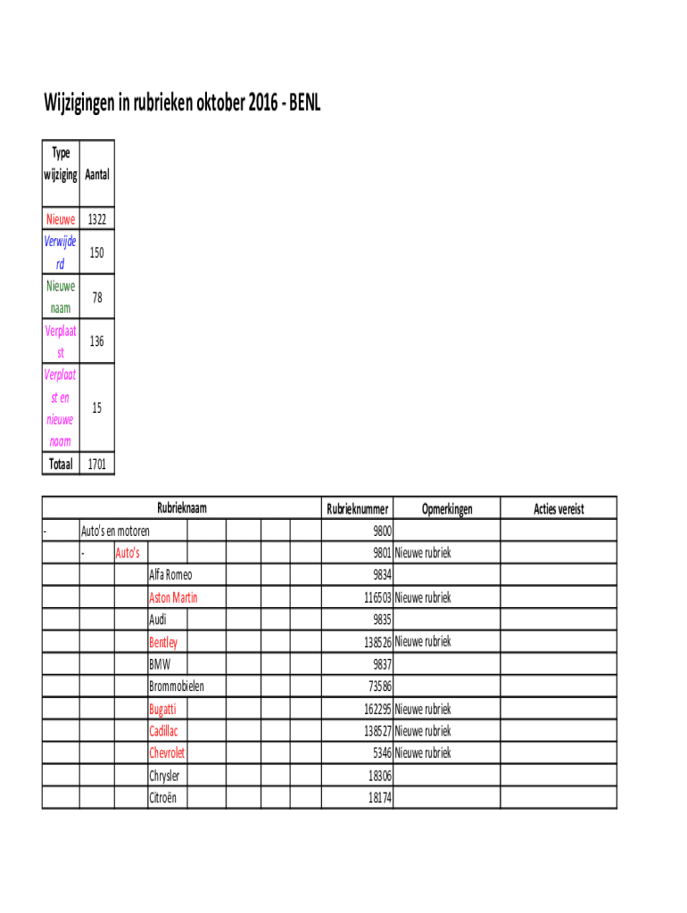 Wijzigingen in rubrieken October 2016 BELL Type winging AANAL Noose Verde rd Noose Nam Verdant st en noose Nam Totaal1322 150 78 13615 1701 RubrieknaamAuto\'s en motored Auto\'s Alfa Romeo Aston Martin