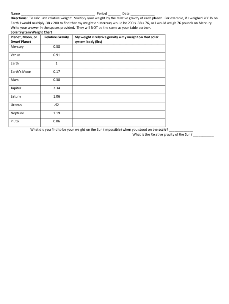 Name ___ Period ___ Date ___ Directions: To calculate relative weight: Multiply your weight by the relative gravity of each planet. For example, if I weighed 200 lb on Earth I would multiply .38 ×