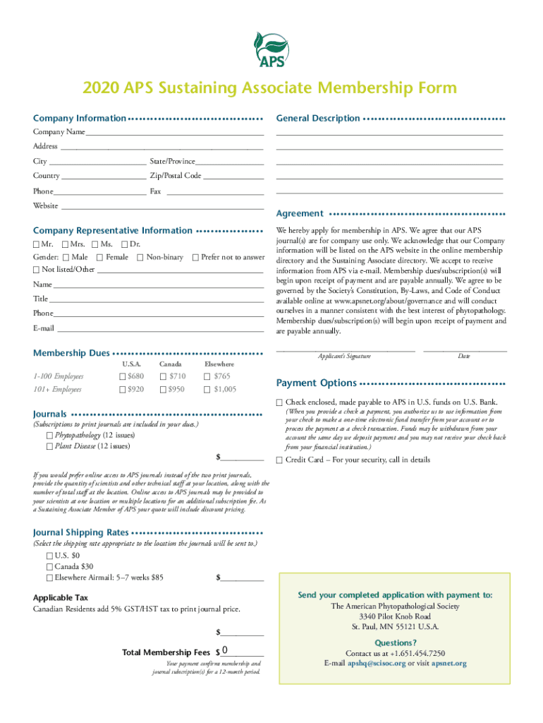 2020 APS Sustaining Associate Membership Form Company InformationGeneral Description Company Name______Address______City___ State/Province______Country___ Zip/Postal Code______Phone___ Fax ______Website___Company