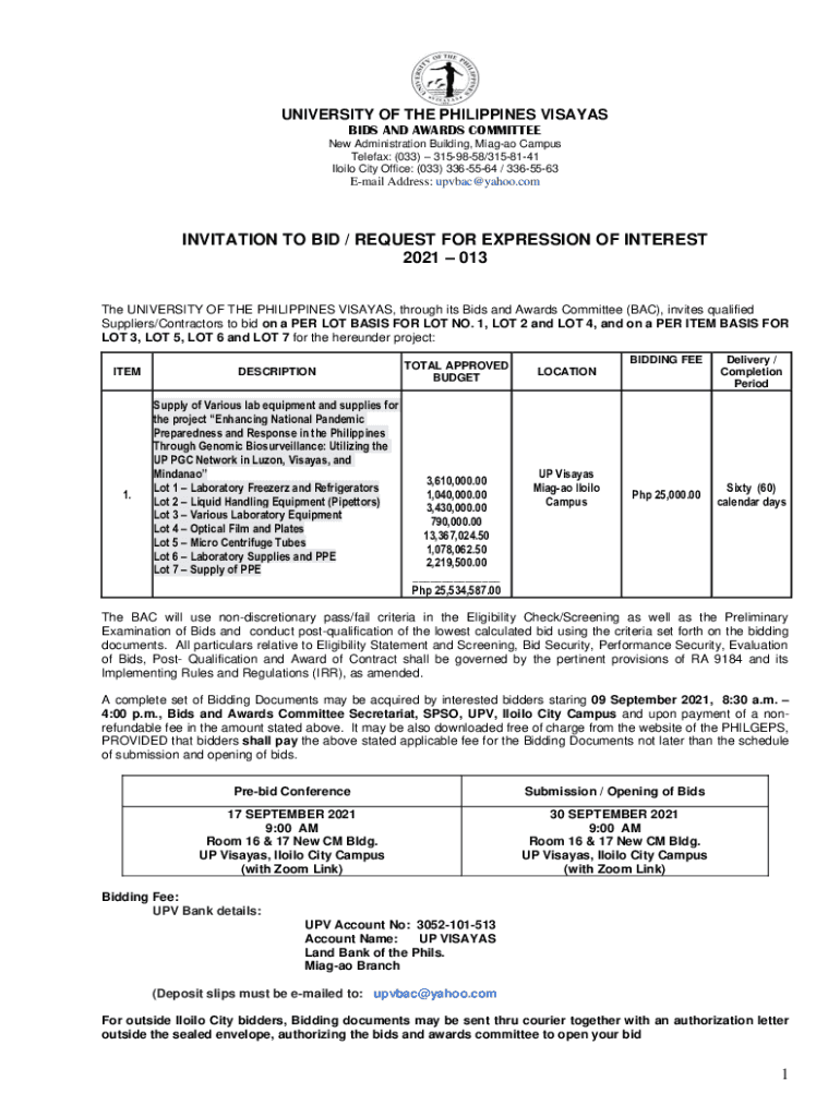 UNIVERSITY OF THE PHILIPPINES VISAYANS BIDS AND AWARDS COMMITTEE New Administration Building, Iago Campus Telefax: (033) 3159858/3158141 Lilo City Office: (033) 3365564 / 3365563Email Address: upvbac@yahoo.comINVITATION