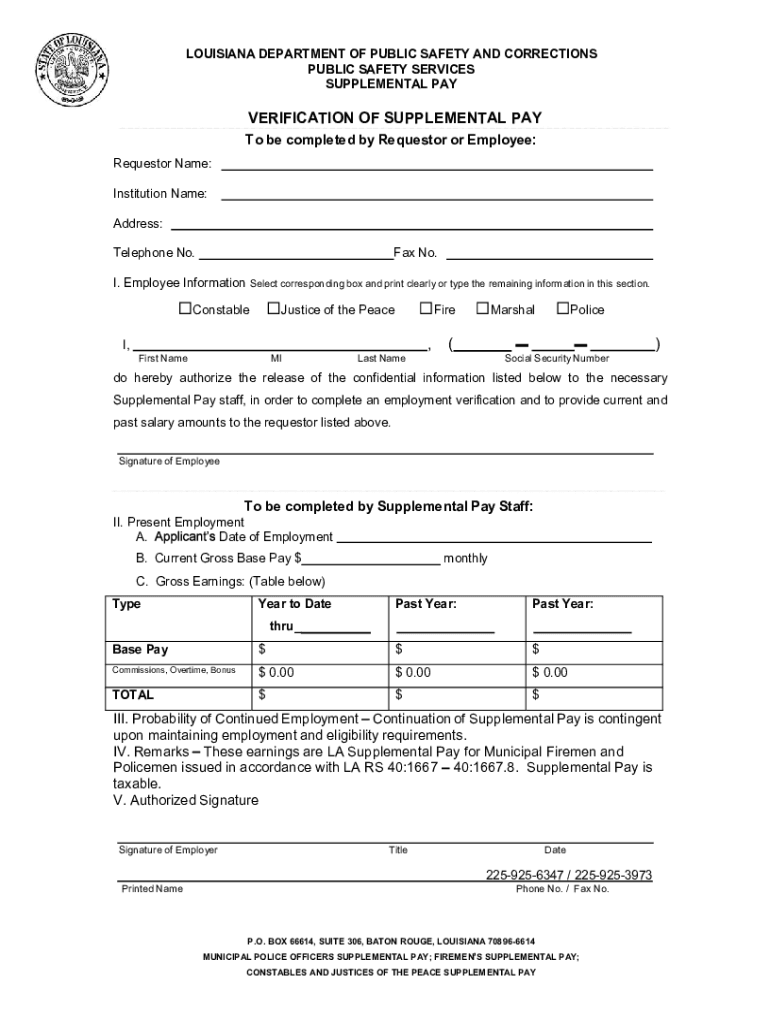 LOUISIANA DEPARTMENT OF PUBLIC SAFETY AND CORRECTIONS PUBLIC SAFETY SERVICES SUPPLEMENTAL VERIFICATION OF SUPPLEMENTAL PAY To be completed by Requestor or Employee: Requestor Name: Institution Name: