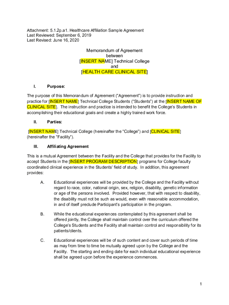 Get the free 5.1.2p.a1. Healthcare Affiliation Sample Agreement. Healthcare Affiliation Sample Ag...