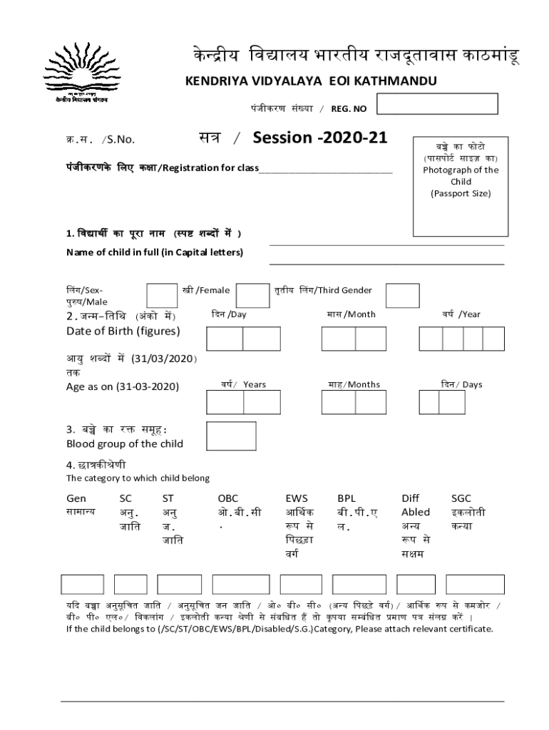 ___ __ KENDRA HIMALAYA ___ EOI KATHMANDU / REG. NO/ Session 202021. /S. No. /Registration for class___1. (()Photograph of the Child (Passport Size))Name of child